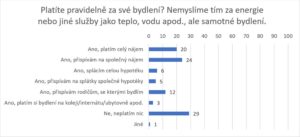 Mladí Češi za své bydlení často vůbec neplatí, jedná se téměř o třetinu lidí ve věku 16–30 let. Další čtvrtina přispívá na společný nájem a pětina ho platí celý. V tomto ohledu je podstatné brát v úvahu konkrétní věk mladých lidí. Především v nejmladší věkové kategorii 16–20 let bydlí většina u rodičů (82 %), jedná se převážně o středoškoláky, kteří za bydlení obvykle neplatí. Ve věku 26–30 oproti tomu s rodiči žije jen 17 % lidí. Není zřejmě překvapením, že s přibývajícím věkem mladí za své bydlení platí častěji. Ve věku 16–20 let vůbec neplatí 67 %, v kategorii 21–25 let 23 % a mezi lidmi ve věku 26–30 se jedná o 12 %.