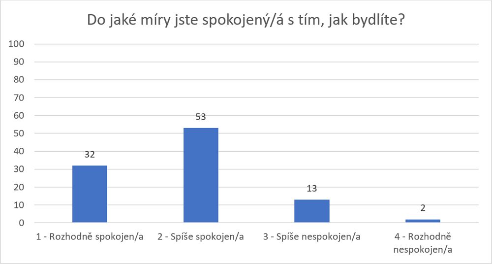 Z výsledků vyplývá, že 85 % mladých je se svým bydlením spokojeno. Mohlo by se zdát, že výtky ke svému způsobu bydlení budou mít hlavně lidé, kteří žijí u rodičů nebo ve spolubydlení, ale není tomu tak. Lidé žijící v páru nebo samostatně jsou nespokojeni ve stejné míře. V každém případě 15 % mladých jejich bydlení skutečně nevyhovuje a vztahy v domácnosti jsou jedním z uváděných problémů. Jde právě o mladé, kteří stále bydlí s rodiči, a situace jim nadále nevyhovuje, nebo lidi ve spolubydlení, kteří si stěžují například na omezené soukromí. Další skupinu tvoří ti, kteří jsou nespokojeni se samotným bydlením. Nevyhovuje jim lokalita nebo stav či velikost nemovitosti, případně cena. Stejná míra spokojenosti s vlastním bydlením je jak v Praze, tak menších městech a obcích.