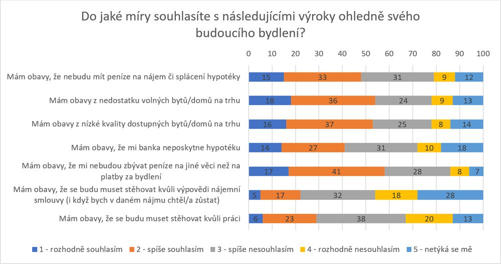 Z výsledků vyplývá, že největší obavy mají mladí z toho, že jim kvůli placení bydlení nebudou zbývat peníze na nic dalšího (58 %). Velké znepokojení vychází i z nedostatku volných bytů na trhu (54 %) a jejich špatné kvality (53 %). Téměř polovina mladých má také strach, že vůbec nebude mít na bydlení peníze a nezvládne platit nájem nebo hypotéku. 41 % mladých má také obavy, že jim banka úvěr ani neposkytne. Strach z budoucího bydlení a zvládání finanční situace je mezi mladými značný. Ukazuje se, že pokud mladí mají pochybnosti o svém bydlení, mají často obavy ze všech nabízených položek, na které jsme se ptali. U většiny položek deklarují o něco menší znepokojení muži než ženy. Muži častěji berou v potaz nutnost stěhování se kvůli práci. Zajímavým zjištěním je, že Pražané nemají větší obavy, přestože právě v Praze je situace s bydlením nejkritičtější.