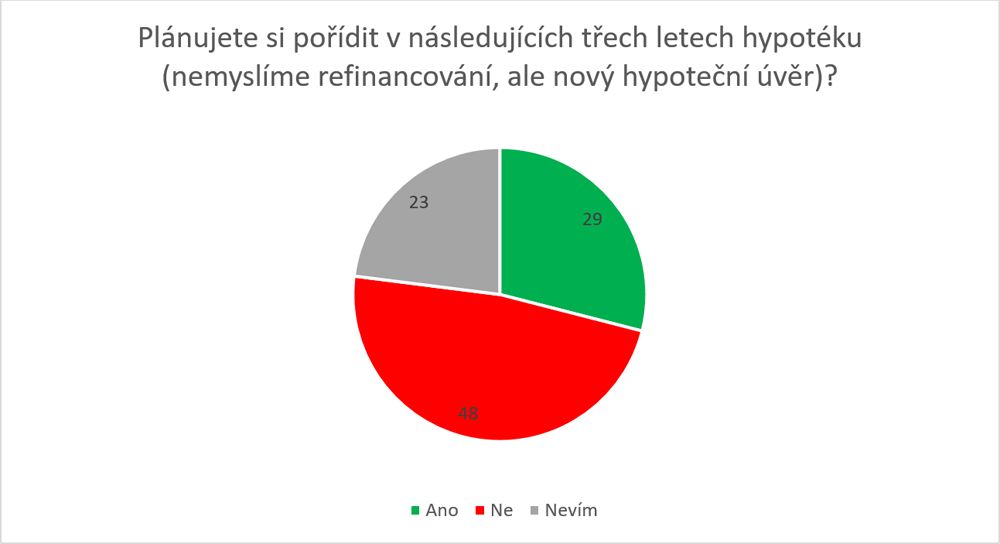 Téměř třetina mladých si v následujících třech letech plánuje pořídit hypotéku, polovina tuto vizi nemá a čtvrtina zatím nemá v této otázce jasno. Muži a ženy jsou v tomto ohledu zajedno. S postupujícím věkem tento zájem stoupá. Ve věku 26–30 let plánuje hypotéku 40 % lidí, oproti tomu v kategorii 16–20 let pouze 12 %. Výrazně vyšší zájem je také zaznamenán v Praze, kde se na hypotéku chystá 38 % mladých lidí. Častěji se k ní kloní i vysokoškoláci, a to téměř polovina z nich.