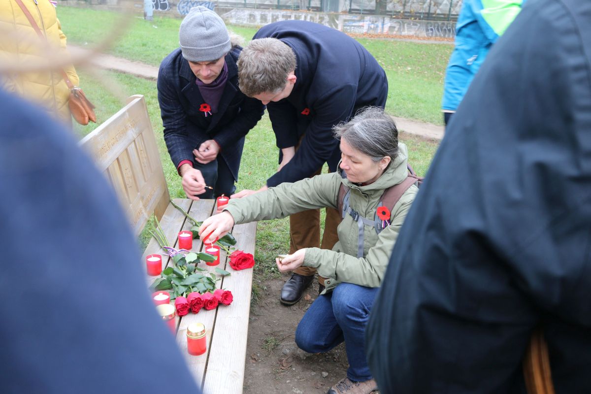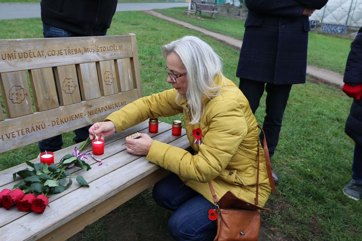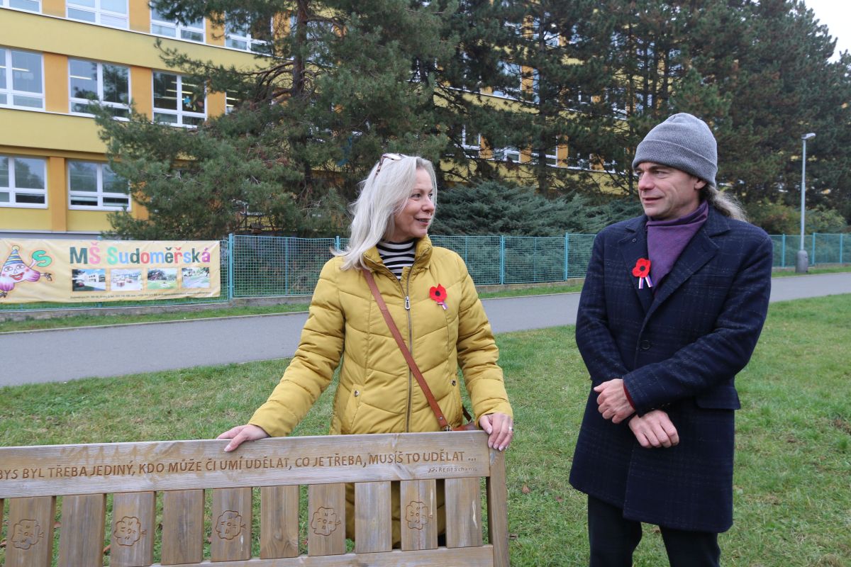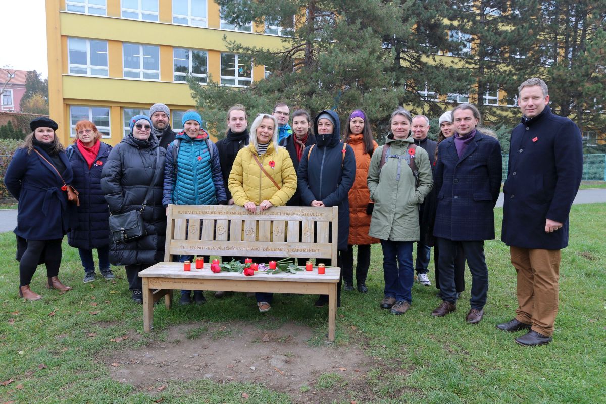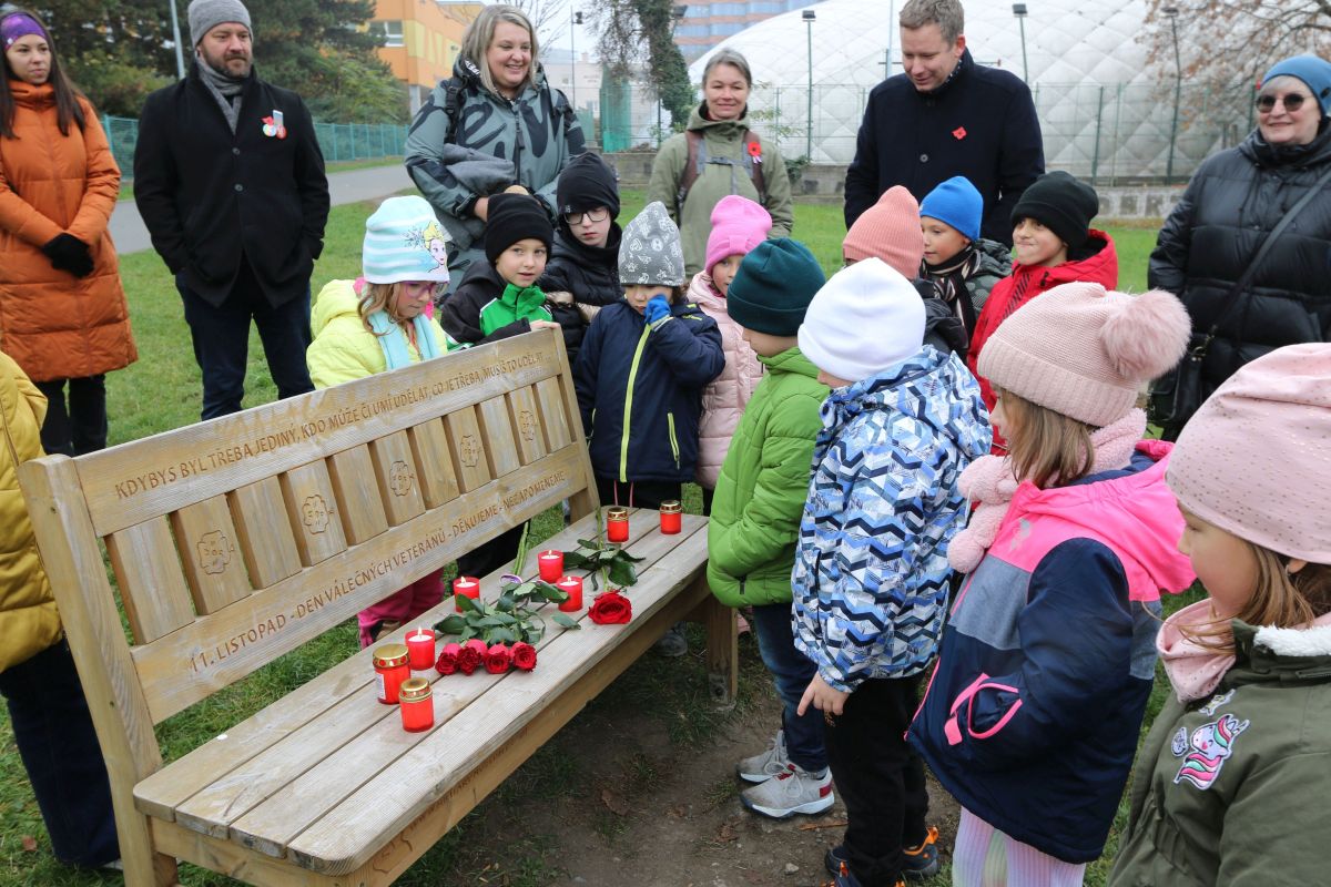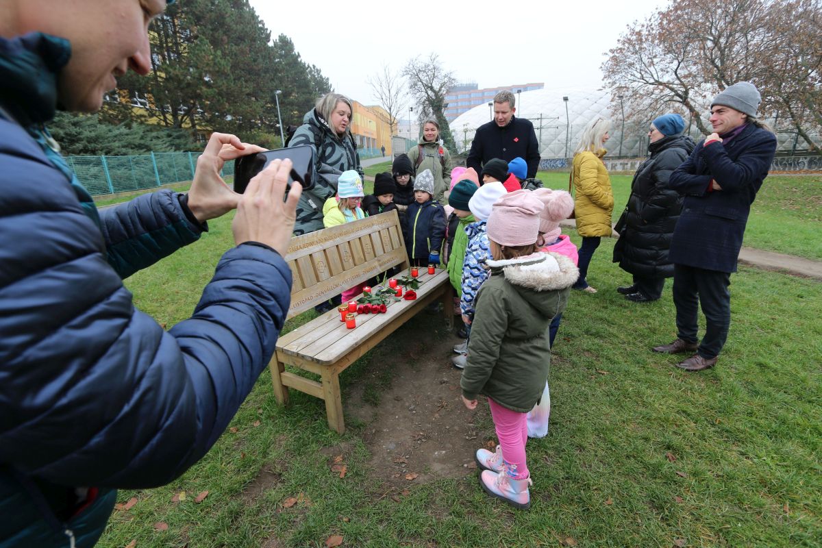 O oživení vzpomínkového setkání se letos postaraly malé děti z blízké Základní školy Chelčického, kteří se s paní učitelkou přišly na lavičku podívat.