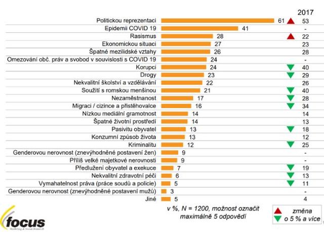 Za největší problém ČR považují studenti nejčastěji politickou reprezentaci (61 %). Výrazně kritičtější vůči politické reprezentaci byli gymnazisté z rodin s nejvyšší životní úrovní (71 %). Jako nový problémový okruh se v průzkumu objevila epidemie nemoci COVID 19. Jde o druhé nejobsazenější téma, které vnímá jako problém 41 % respondentů. Největší rozdíly ve vnímání problémů ČR jsou mezi studenty gymnázií a učilišť. Gymnazisté považují častěji za problematickou politickou reprezentaci, korupci a kvalitu vzdělání. Studenti učilišť častěji omezování občanských práv a svobod kvůli epidemii COVID 19, drogy, nezaměstnanost a migraci.