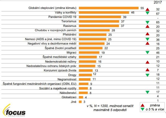 V globální perspektivě narostlo dramaticky vnímání hrozby klimatické změny, která dominuje žebříčku klíčových celosvětových problémů (55 %). Nárůst závažnosti tohoto problému pro téměř čtvrtinu respondentů (23 %) odsunul na druhé místo obecnou kategorii války a konflikty (46 %), kterou následuje nová agenda COVID 19 (39 %). Výrazně narostlo i vnímání tématu rasismu (37 %). Podobně jako u problémů ČR se i u globálních problémů liší nejvíce odpovědi studentů gymnázií a učilišť. Gymnazisté vidí častěji problém ve změnách klimatu, válkách a chudobě rozvojových zemí. Studenti z učilišť častěji uvádí pandemii COVID 19, terorismus, a jiné nemoci.