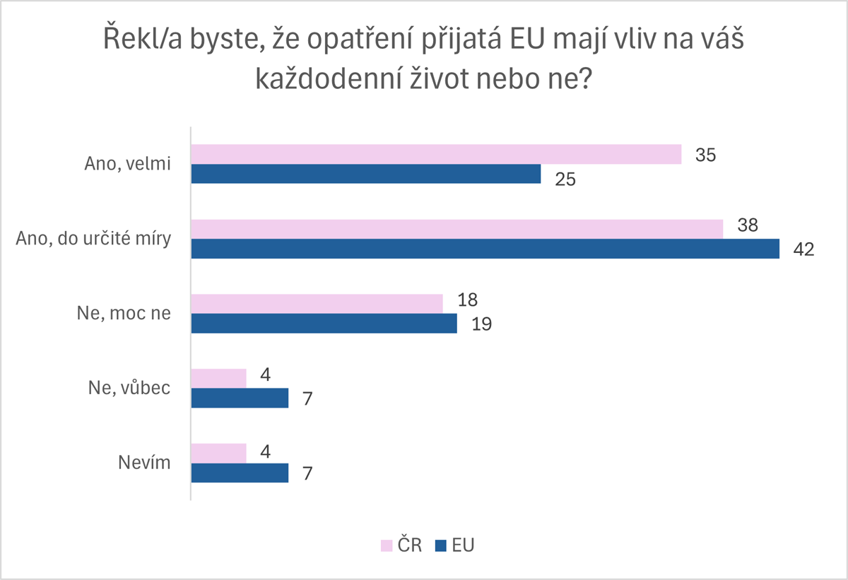 Z výsledků vyplývá, že téměř tři čtvrtiny (73 %) mladých Čechů věří, že opatření EU mají vliv na jejich každodenní život. Je to o 12 % více než je v celounijním průměru.