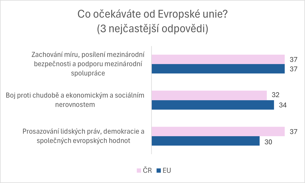 Mladí lidé od Evropské unie nejvíce očekávají, že pomůže v zachování míru a boji proti chudobě nebo v prosazování lidských práv. Výsledky se mezi Čechy a mladými z ostatních zemí příliš nemění, vyjma provazování lidských práv. Toto očekávání od EU mají Češi o 7 % více. Zachování míru je nejvíce důležité pro Rakušany a Estonce (47 %), nejméně pro Španěly (29 %) a Iry (30 %), dále ale i Bulhary a Lucemburčany (shodně 32 %). Boj proti chudobě podporují mladí ze států, jako je Řecko (45 %) a Kypr (50 %), tuto roli od EU očekávají v menší míře Nizozemci a Dánové (shodně 26 %) a Malťané (25 %). Prosazování lidských práv je nejdůležitější pro Švédy (44 %), dále je to významnou úlohou pro Čechy (37 %), méně důležité se prosazování lidských práv jeví Bulharům (26 %) nebo Francouzům (24 %).