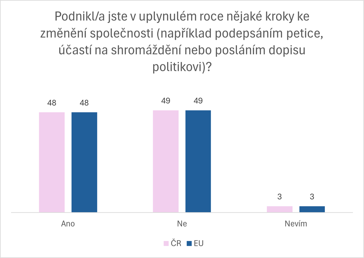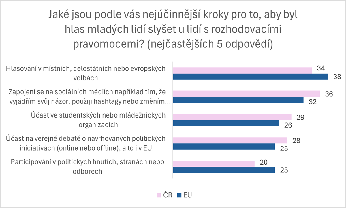 Mladí lidé se zhruba v polovině případů sami snaží ovlivnit politické dění, ať už se jedná o podepsání petice, účast na shromážděních apod. Výsledky jsou v tomto ohledu totožné v rámci celounijního průměru. Nejčastěji se mladí Evropané angažují v oblasti lidských práv, změny klimatu, rovnosti a wellbeingu.