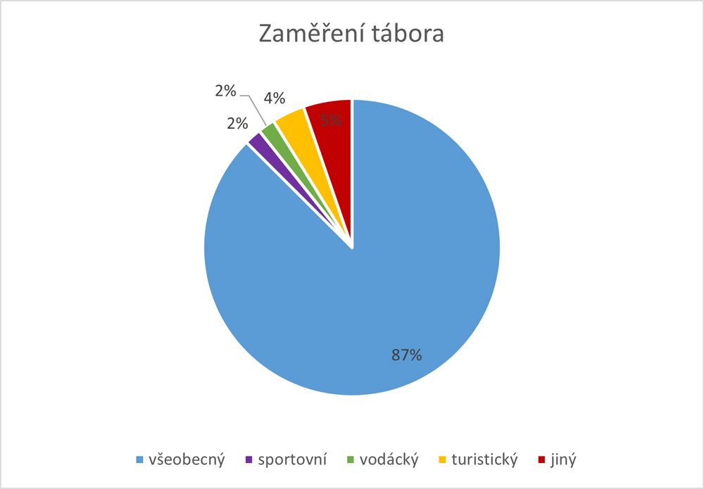 Mezi tábory vévodí ty se všeobecným zaměřením (87 %). Jejich počet je podobný jako loňský rok. Tyto tábory jsou typické aktivitami spojenými s pobytem v přírodě. Oblíbené jsou tábory turistické a vodácké, které jsou typické přespáváním na různých místech a spojené s poznávacími aktivitami na větším území. Jejich četnost je už ale výrazně nižší. Mezi další typy táborů patří sportovní, které se orientují na konkrétní sportovní aktivity, například cyklistiku. Zbylé tábory jsou zaměřeny jiným směrem. Jedná se o vědecko-technické tábory, ekologické nebo také umělecké.