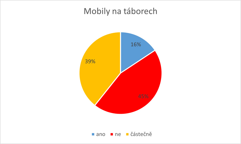 Analýza ukazuje, že téměř polovina (45 %) pořadatelů táborů vůbec nepovoluje využívání mobilních telefonů ve volném čase. Dalších 39 % čas s komunikačními technologiemi alespoň částečně omezuje. Některé tábory mohou využívat mobilní telefony jako pomůcky během táborových činností, my se ale zaměřovali pouze na volný čas mimo hlavní program táborových aktivit. V tomto čase osobního volna se naprostá většina táborů snaží regulovat využívání mobilních zařízení.
