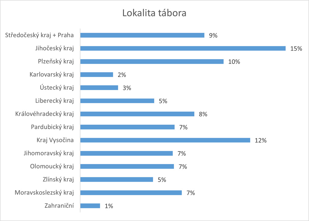 Konání táborů v jednotlivých krajích zůstává i nadále stabilní. Nejoblíbenějšími lokalitami pořadatelů jsou Jihočeský kraj a Vysočina. Naopak nejméně táborů je pořádáno v Karlovarském kraji a Ústeckém kraji. Nejčastějšími zahraničními destinacemi táborů jsou sousední země, a to konkrétně Slovensko. Zahraničních táborů je ale celkově pořádáno minimum.