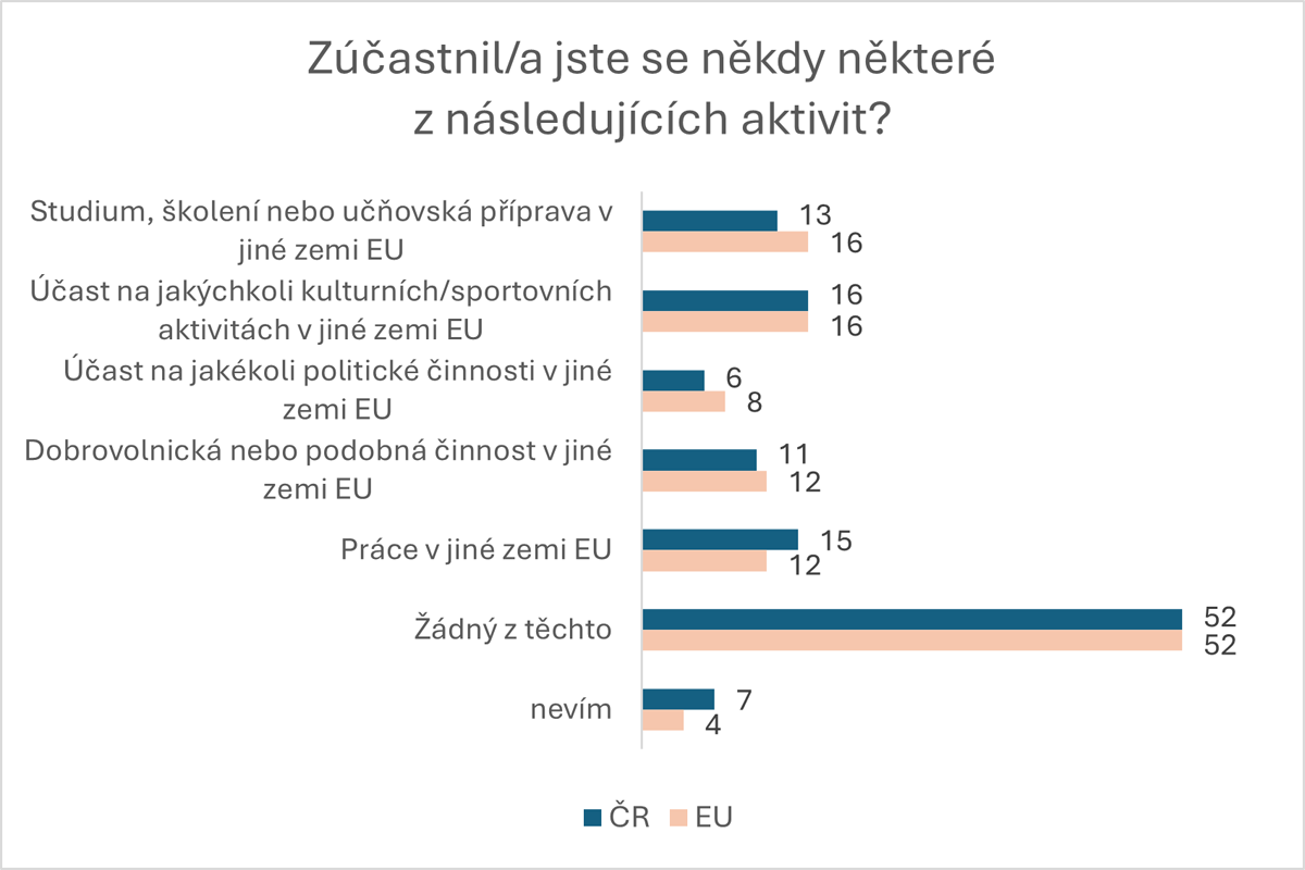 Polovina mladých lidí se dosud nezúčastnila žádné z vybraných zahraničních aktivit. Pokud ano, jedná se nejčastěji o kulturní či sportovní aktivity nebo práci, následují pracovní či studijní zkušenosti. Nejvíce studijních zkušeností mají Malťané (23 %), Kypřané (25 %) a Lucemburčané (30 %) nejméně naopak Maďaři (10 %) a Švédové (9 %). Kulturní a sportovní aktivity se v největší míře účastní Estonci a Bulhaři (shodně 25 %) a Lucemburčané (28 %), naopak Kypřani a Finové (12 %) nebo Portugalci (11 %) je vyhledávají méně. Politických aktivit v zahraničí se účastní nejvíce Lucemburčani (23 %), u všech ostatních zemí je to výrazně méně, největší rozdíl je patrný u Čechů a Slováků (6 %), Španělů (5 %) a Poláků (4 %). Dobrovolnictví je nekompromisně nejpraktikovanější v Lucembursku (32 %), dále následuje až s velkým odstupem Lotyšsko a Bulharsko (19 %). Zahraniční pracovní aktivity mají nejčastěji Rumuni (21 %) a Finové, Poláci a Lucemburčani (18 %). Nejméně je tomu u Maďarů, Kypřanů, Španělů, Italů a Řeků (10 %).