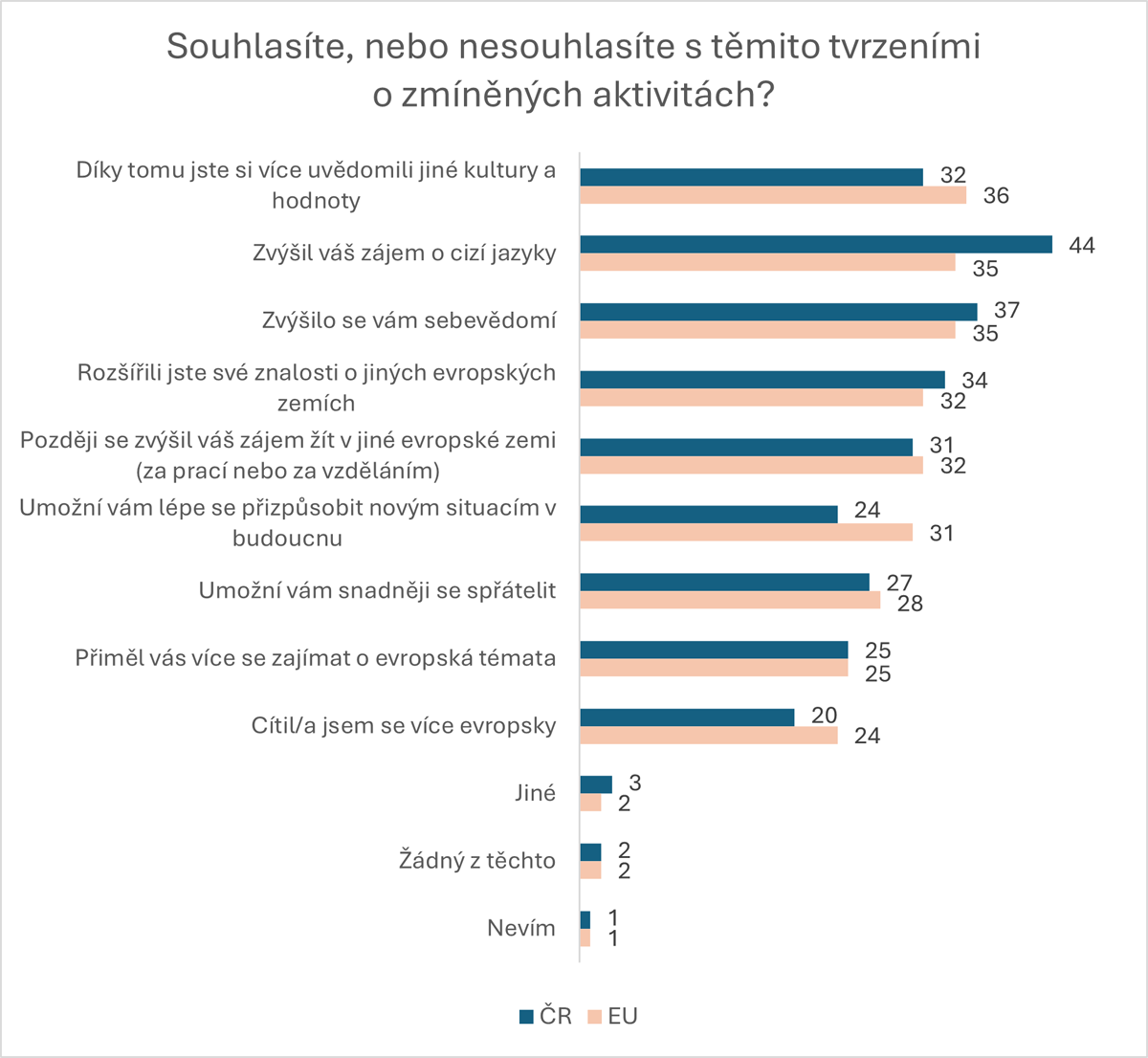 Mladí Evropané si na základě účasti na těchto aktivitách nejvíce cení uvědomění si jiných kultur a hodnot, zvýšení zájmu o cizí jazyky nebo zvýšení sebevědomí. Češi se v tomto ohledu od celounijního průměru liší. Nejvíce se touto zkušeností zvýšil jejich zájem o cizí jazyky, tohoto benefitu si cenní necelá polovina (44 %) dotázaných. Dále zmiňují zvýšené sebevědomí a rozšíření znalostí o jiných evropských zemích.