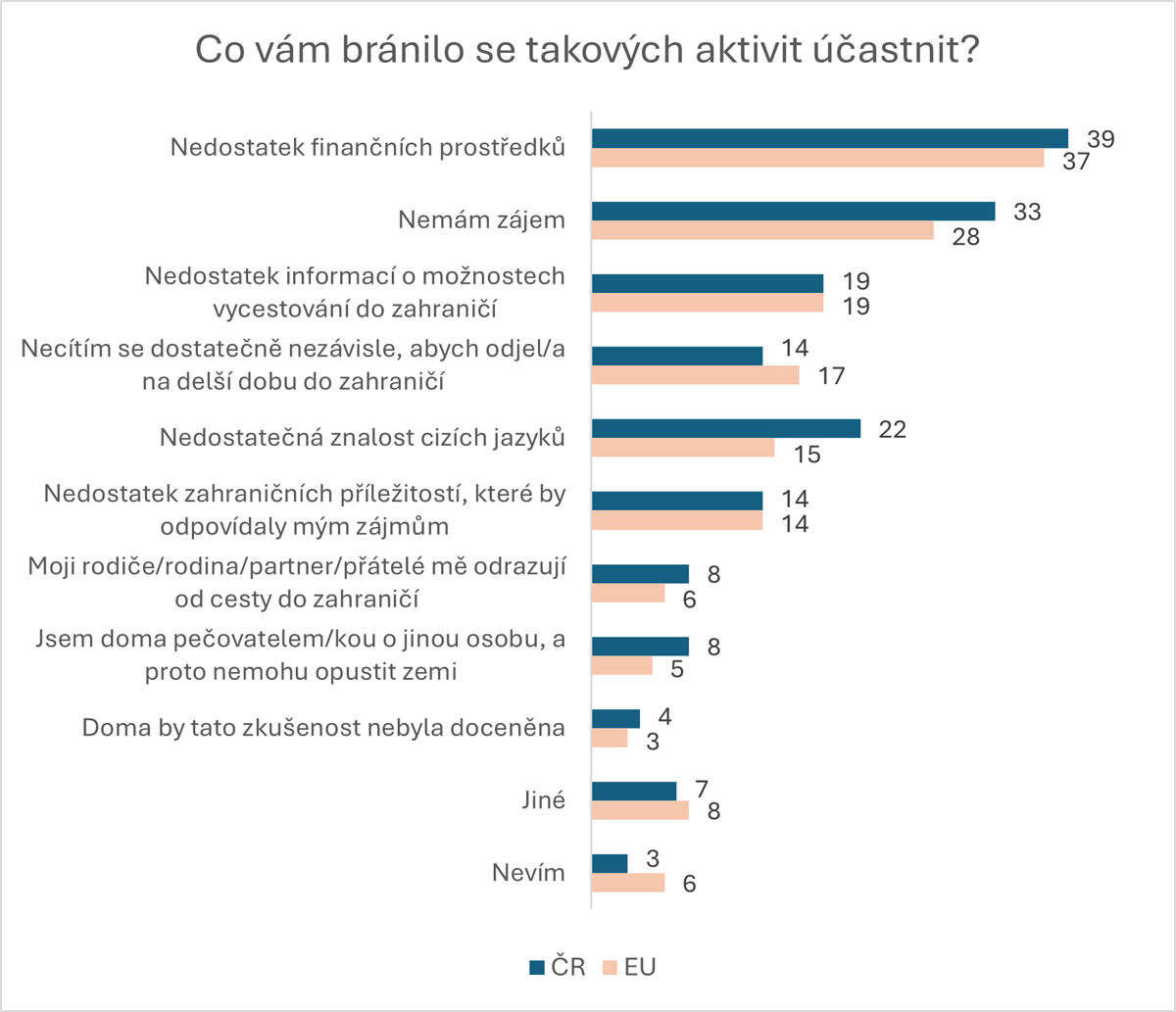 Jako největší překážkou ve vycestování za zmíněnými aktivitami vidí Evropané nedostatek finančních prostředků, často je ale zmiňován i nezájem. Češi jsou v tomto ohledu s ostatními Evropany jednotní, o něco častěji ale zmiňují právě nezájem o tyto aktivity (28 vs. 33 %). Ve větší míře také uvádějí nedostatečnou znalost jazyků jako překážku (22 vs. 15 %). Naopak odrazování blízkých lidí nebo nutnost péče o jinou osobu nejsou příliš častými důvody, stejně tak nedocenění doma za tuto zkušenost.