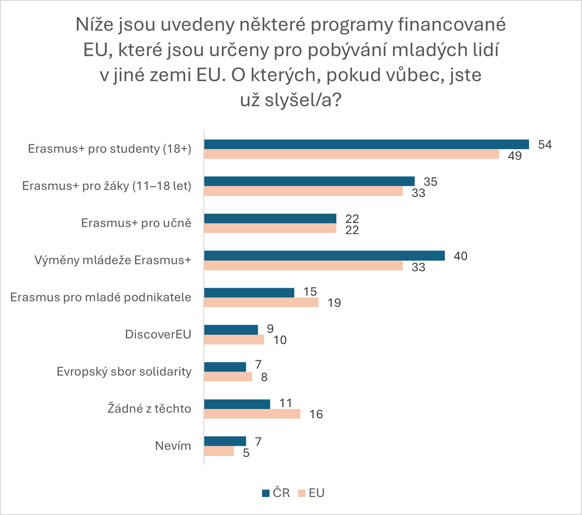 Polovina mladých lidí v Evropě zná z výše zmíněných programů Erasmus+ pro studenty, třetina má povědomí o Erasmu+ pro žáky a výměny mládeže Erasmus+. Další aktivity jsou mezi mládeží výrazně méně známé. Mladí Češi znají zmíněné programy dokonce častěji, než udává unijní průměr. Jak uvádí Dům zahraniční spolupráce: „Program Erasmus+ umožňuje mezinárodní výjezdy a podporuje mezinárodní spolupráci. Přináší inovace do vzdělávání a v účastnících podporuje všeobecný rozvoj dovedností. Zpřístupňuje českým organizacím nenahraditelné zkušenosti ze zahraničí a pomáhá jim navázat cenné mezinárodní spolupráce.“ Mezi mladými lidmi se v rámci zahraničních zkušeností těší největšímu zájmu. Pod program Erasmus+ dále patří i DiscoverEU, který umožňuje mladým lidem se znevýhodněním cestovat po Evropě. Evropský sbor solidarity nabízí možnosti dobrovolnické práce v zahraničí.