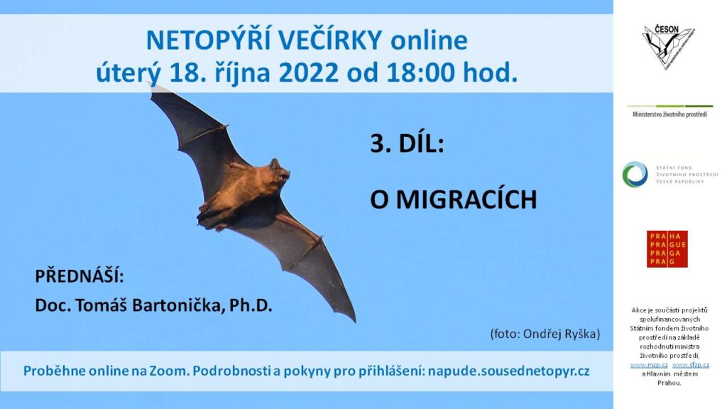 Seriál popularizačních webinářů České společnosti pro ochranu netopýrů seznamuje širokou veřejnost prostřednictvím odborníků s pozoruhodným životem i ochranou našich létajících savců. V úterý 18. října 2022 se lze těšit na téma netopýřích migrací, které přiblíží doc. Tomáš Bartonička z Masarykovy univerzity v Brně, ředitel ČESON. Účast na webináři je zdarma a předchozí díly lze shlédnout na youtube kanálu ČESON. Zde najdou zájemci i další zajímavá videa, nejnověji např. návod k tomu, co dělat, najdeme-li zraněného netopýra.