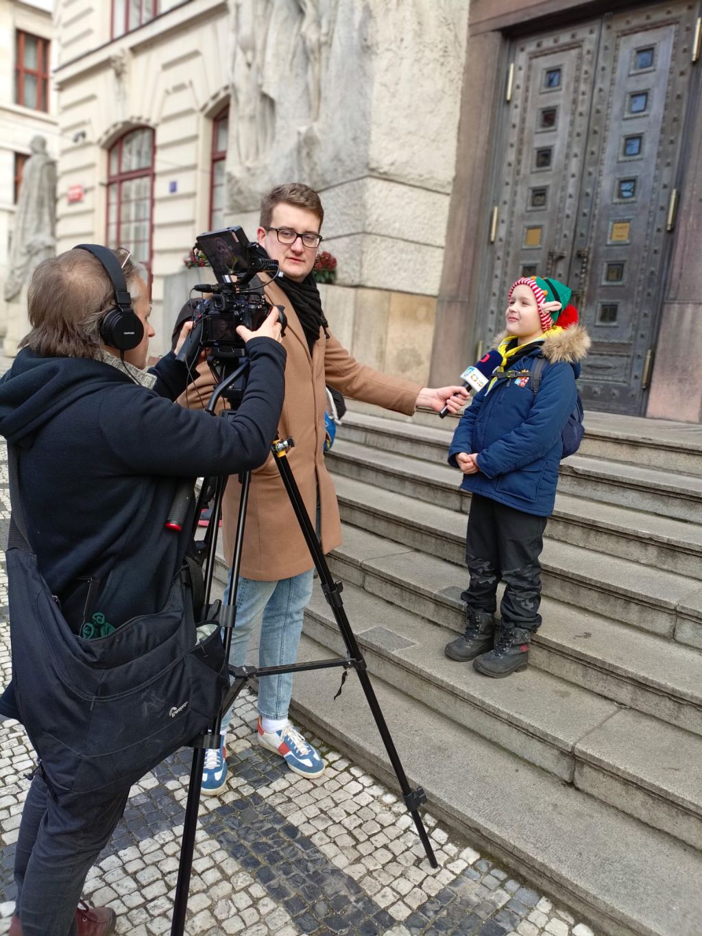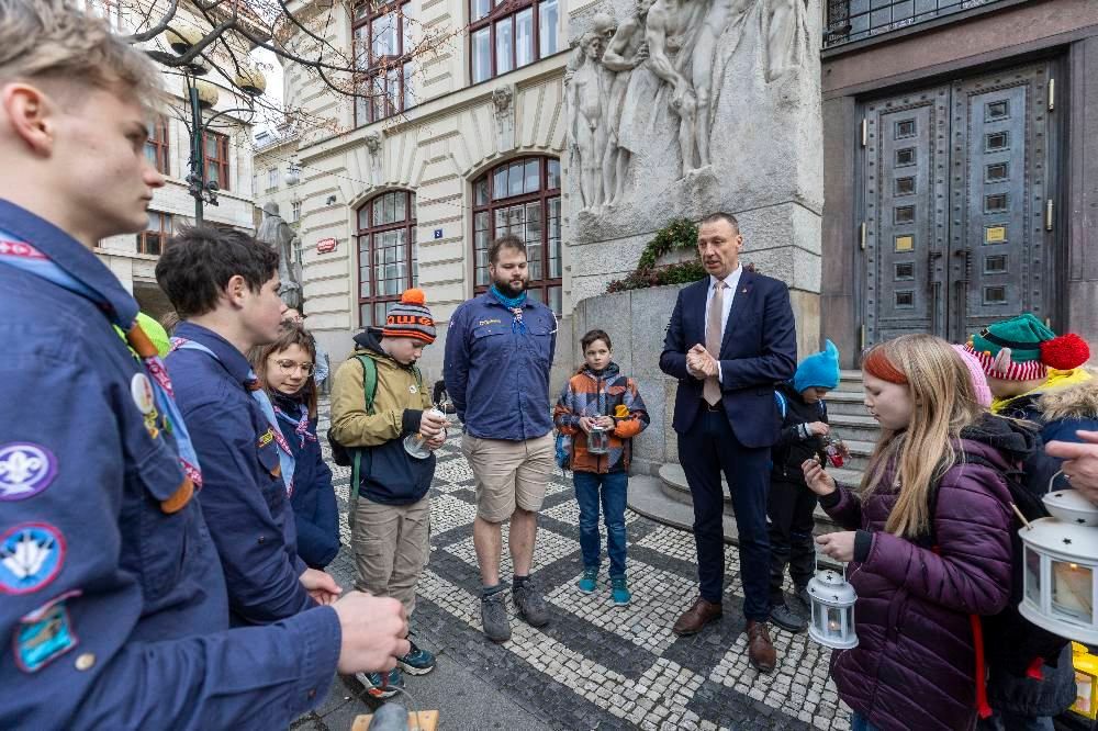 Vodní skauti ze 170. oddílu Ze-Hnje-She-Kha z Malé Strany se vydali z nádraží pěšky přes Staré Město, a cestou předali Světýlko na Mariánském náměstí zástupci Magistrátu hl. m. Prahy, Janu Wolfovi, radnímu pro kulturu. Tam skauty a skautky zastihli reportéři Zpráviček a mladší vlčata a světlušky překvapili několika otázkami.