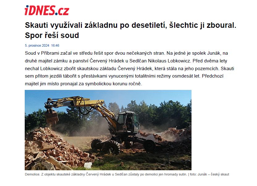 Soud v Příbrami začal ve středu řešit spor dvou nečekaných stran. Na jedné je spolek Junák, na druhé majitel zámku a panství Červený Hrádek u Sedlčan Nikolaus Lobkowicz. Před dvěma lety nechal Lobkowicz zbořit skautskou základu Červený Hrádek, která stála na jeho pozemcích. Skauti sem přitom jezdili tábořit s přestávkami vynucenými totalitními režimy osmdesát let. Předchozí majitel jim místo pronajal za symbolickou korunu ročně.