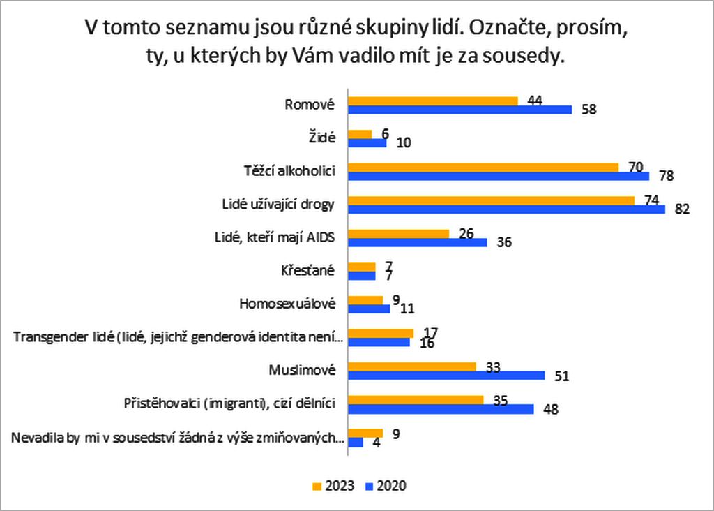 Mladí lidé jsou vůči zmíněným skupinám lidí tolerantnější než v roce 2020. Jejich potřeba distance se snížila především ve vztahu k etnickým a národnostním menšinám. K největšímu poklesu došlo u Romů, muslimů a přistěhovalců, a to o 13–18 %. Můžeme v tomto ohledu mluvit o snížení míry rasismu a xenofobie mezi českou mládeží. Zároveň mladým méně vadí lidé s AIDS, alkoholici a drogově závislí. U ostatních skupin k výrazným změnám nedošlo.