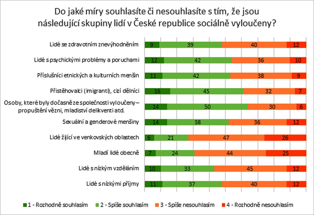 Mladí lidé silně vnímají problematiku sociálního vyloučení v České republice. Největšímu počtu z nich připadají vyloučeni například bývalí vězni nebo mladiství delikventi (64 %), dále přistěhovalci a cizí dělníci (61 %). Problémy vnímají i u příslušníků etnických a kulturních menšin a lidí s psychickými problémy a poruchami (54 %). Problematicky jsou mladými vnímáni i lidé s nízkými příjmy a vzděláním, sexuální a genderové menšiny a lidé se zdravotním znevýhodněním. Naopak mladí lidé obecně a obyvatelé venkova nejsou v tomto ohledu vnímání příliš kriticky. Ani osoby žijící na venkově sebe jako vyloučené nevnímají ve větší míře. Mladí lidé se sociálním znevýhodněním či zdravotním znevýhodněním se naopak staví k jednotlivým položkám ve větší míře kritičtěji. Především vnímají jako sociálně vyloučené častěji lidi se zdravotním znevýhodněním, s psychickými poruchami, příslušníky etnických menšin, obyvatele venkovských oblastí nebo lidi s nízkým vzděláním nebo příjmy. Větší míru sociálního vyloučení u zmíněných skupin lidí vnímají i sexuální menšiny nebo lidé z etnických menšin.