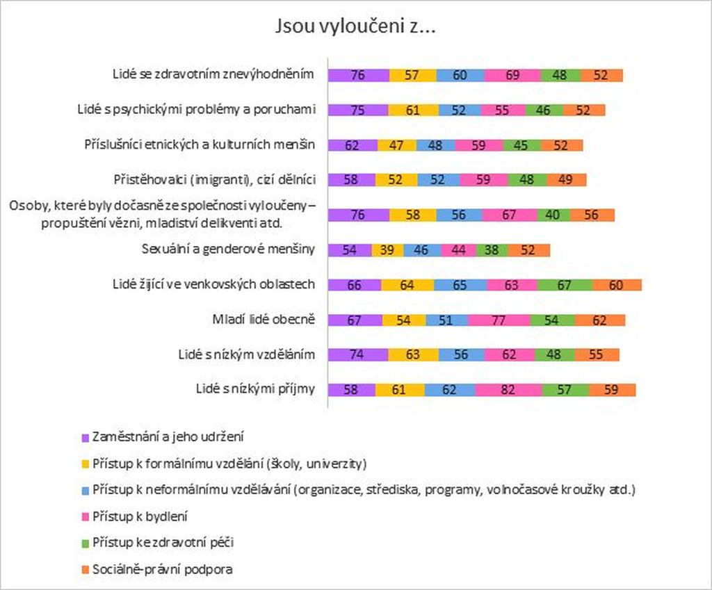 Z výsledků vyplývá, že nejvíce jsou vybrané skupiny lidí vnímány jako vyloučené v rámci zaměstnání a jeho udržení a v přístupu k bydlení. Naopak zdravotní péče je podle mladých dostupnější. Lidé žijící ve venkovských oblastech jsou v souhrnu vnímáni jako nejvíce vyloučeni. Toto zjištění je v rámci analýzy překvapivé, protože nekoresponduje s obecným vnímáním sociálního vyloučení v předchozím grafu. V rámci něj jsou totiž venkované mladými lidmi nahlíženi jako nejméně vyloučeni. Při konkrétnějším dotazování tedy respondenti mění názor. Nedostupnost služeb se v tomto ohledu ukazuje být jako zásadní překážka. Nejméně vyloučeni v uvedených kategoriích jsou podle mladých sexuální a genderové menšiny.