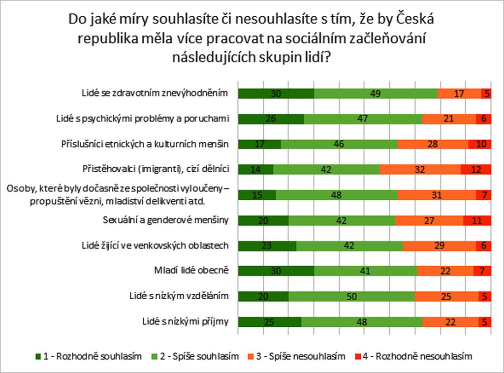 Přestože mají dotázaní rozdílné postoje k sociálnímu vyloučení vybraných skupin lidí, většina podporuje začleňování všech jmenovaných. Mladé lidi a obyvatele venkovských oblastí by měl český stát podporovat a pracovat na jejich začleňování. S tímto tvrzením souhlasí 71 respektive 70 %. Největší podporu mají lidé se zdravotním znevýhodněním (79 %) a lidé s psychickými problémy a poruchami a (73 %). Naopak přistěhovalci a cizí dělníci (56 %), příslušníci etnických a kulturních menšin a bývalí vězni či mladiství delikventi (63 %) jsou mladými lidmi podporováni v sociálním začlenění menší měrou. Jsou sice považováni za sociálně vyloučené, podporu v sociálním začlenění mají však nižší. V případě vězňů a delikventů to může být tím, že jejich vyloučení považují mladí lidé například za osobní selhání či zodpovědnost, a podporu si tím pádem dotyční nezaslouží. U přistěhovalců se nižší zájem o začlenění dá vysvětlit cizím občanstvím těchto lidí a přechodností jejich pobytu v zemi.