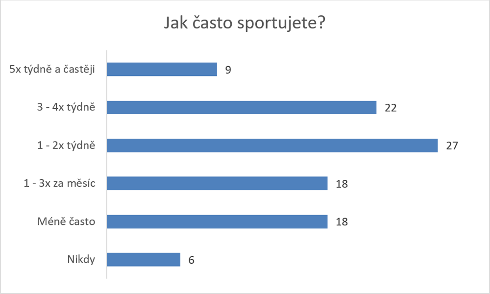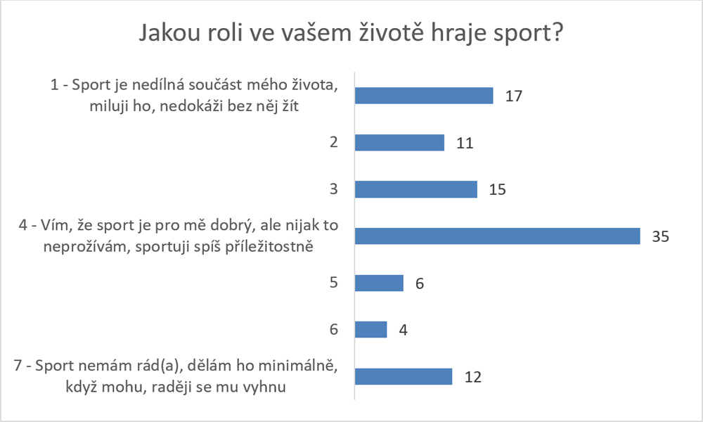 Zhruba třetina mladých lidí má ke sportu celkem laxní vztah. Uvádějí, že sport nijak zvlášť neprožívají a věnují se mu příležitostně. Zhruba pětina ho ráda nemá a celých 12 % se mu zásadně vyhýbá. Pozitivním faktem však je, že 43 % k němu má spíš kladný vztah (odpovědi 1, 2, 3) a 17 % ho přímo miluje a nedokáže si bez sportu život představit. Sport se ukazuje být významně důležitější pro muže než ženy. Užívá si ho 51 % mužů a 38 % žen. Sportu se výrazně častěji věnují lidé s vysokoškolským vzděláním oproti mladým se základním vzděláním nebo vyučím listem (53 vs. 39 %).
