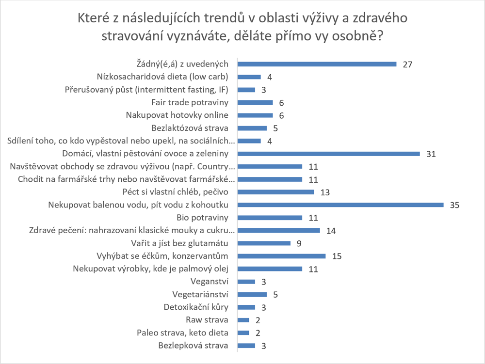 Zhruba třetina dotázaných nenakupuje balenou vodu a preferuje raději kohoutkovou. Určité druhy diet praktikuje 2-4 % mladých. Jedná se například o raw stravu, paleo dietu, přerušovaný půst, low carb a detoxikační kúry. Stejný počet lidí konzumuje pouze bezlepkovou nebo bezlaktózovou stravu. 11 % mladých nakupuje bio a farmářské výrobky nebo chodí do specializovaných prodejen s těmito produkty. 14 % se vyhýbá bílé mouce a cukru a raději volí zdravější varianty. Éčkům a konzervantům se snaží vyvarovat 15 % dotázaných. Přesto, že je veganství popularizovaný způsob stravování, je mezi mladými pouze 3 % veganů. Vegetariánů je 5 %.