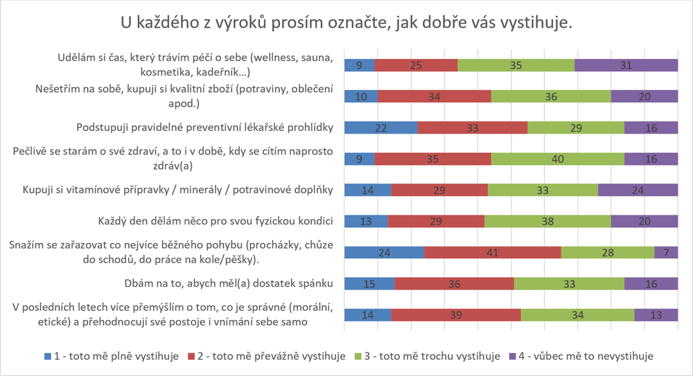 Kolem poloviny mladých se snaží dělat něco pro své zdraví, ať už se jedná o fyzičku (42 %), nebo kupování kvalitních potravin (44 %). Na druhou stranu ale podobné množství mladých moc nechodí na preventivní prohlídky (45 %), ani příliš nedbá o dostatek spánku (49 %). Ženy na sobě šetří častěji než muži. Kvalitní zboží včetně potravin si dopřává 47 % mužů a 40 % žen. Rozdíl je patrný také u preventivních prohlídek. Pravidelně je podstupuje 60 % žen a 50 % mužů (odpovědi 1 a 2 hodnoceny jako souhlasné s výrokem, 3 a 4 jako nesouhlasné).