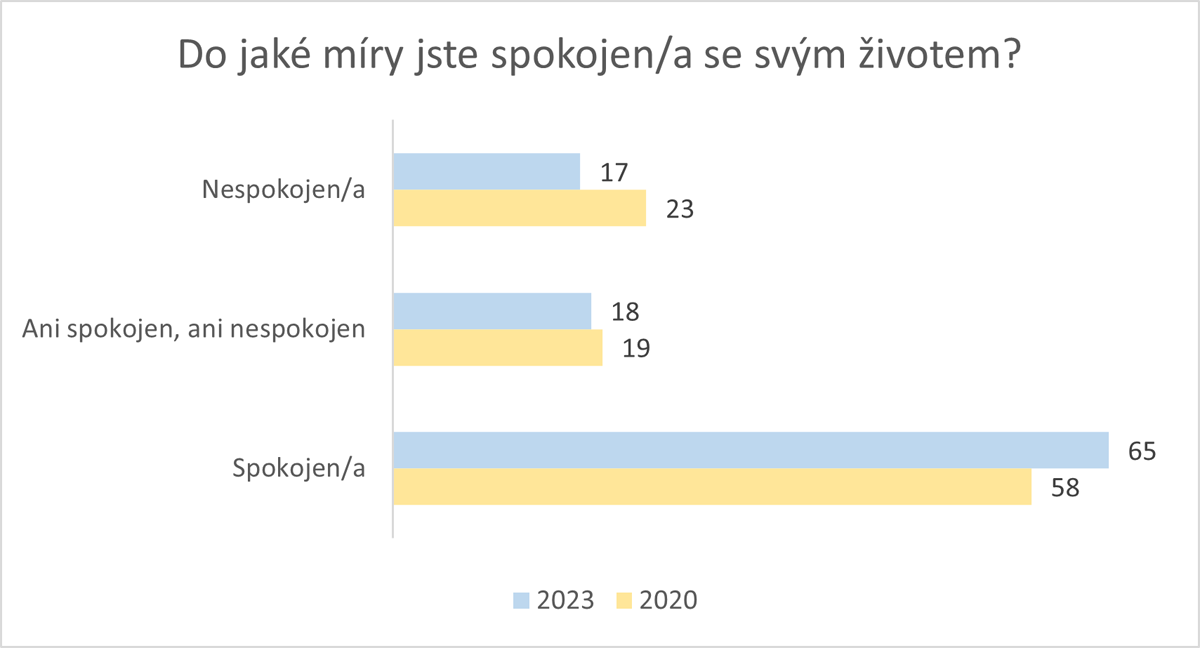 Spokojenost se životem mezi českou mládeží stoupá, mezi lety 2020 a 2023 došlo k navýšení o 7 %. Celková spokojenost se životem je zásadně ovlivněna vnímáním svého zdravotního stavu. Ti, kteří hodnotí svůj zdravotní stav jako špatný, jsou celkově méně spokojeni se životem. Mladí se zkušeností s členstvím v organizaci mládeže jsou se svým životem spokojenější oproti těm, kteří zkušenost s členstvím nemají (76 vs 61 %). Spokojenost se životem je také vyšší mezi držiteli vysokoškolských titulů.