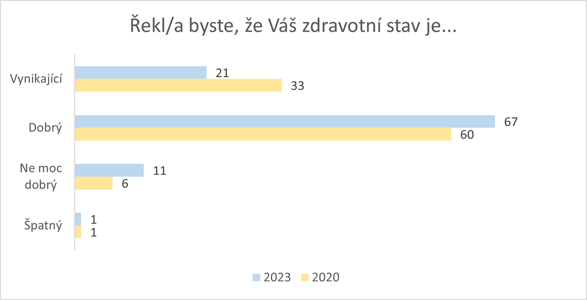 Mladí lidé hodnotí svůj zdravotní stav většinou jako dobrý, 88 % je s ním spokojeno. Oproti roku 2020 je to však méně. Více lidí v té době navíc hodnotilo své zdraví jako přímo vynikající. Jedná se ovšem o období pandemie, dotázaní v této době mohli subjektivně hodnotil své zdraví jinak ve srovnání s přibývajícím počtem vážně nemocných s covidem-19.
