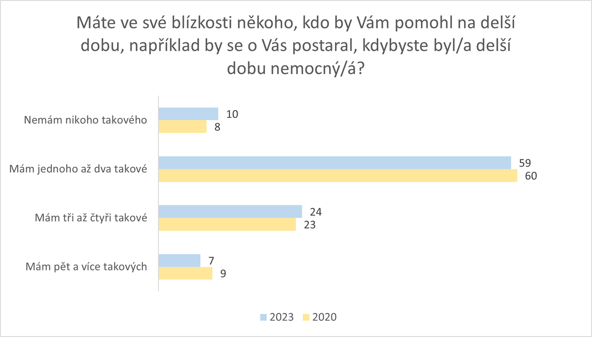 Většina mladých lidí má ve své blízkosti někoho, kde by se o ně postaral, kdyby byli delší dobu nemocní. Nejčastěji mají jednoho až dva takové lidi (59 %). Další čtvrtina má tři až čtyři takto blízké lidi. Desetina mladých však tvrdí, že nemá vůbec nikoho. Výsledky se ve srovnání s rokem 2020 příliš neliší. Nikoho blízkého nemají častěji lidé s výučním listem (20 %) nebo ti ve špatné finanční situaci (16 %). Naopak více blízkých uvádějí mladí, kteří jsou členy organizací mládeže.