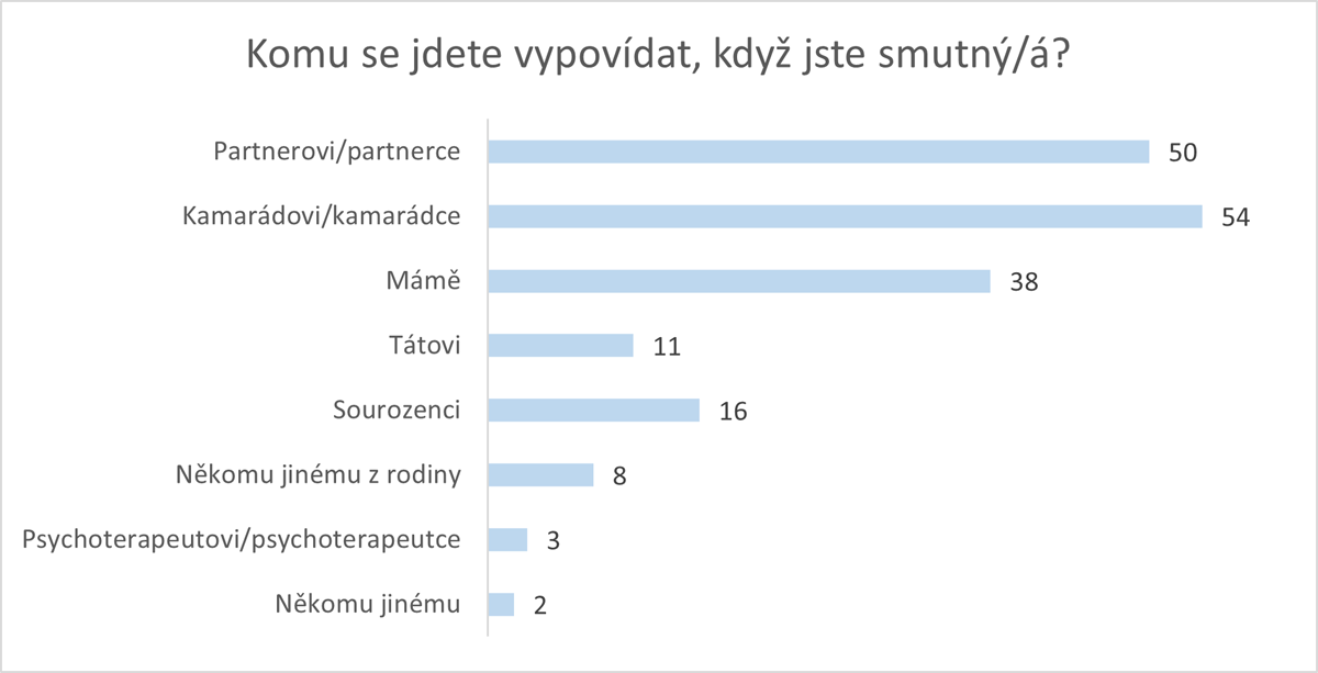 Nejčastěji se mladí vypovídají partnerům či partnerkám (50 %) a kamarádům nebo kamarádkám (54 %). Ženy mají oproti mužům větší tendenci svěřit se partnerovi či partnerce (59 vs. 41 %), muži naopak o něco více tíhnou k tátovi (14 vs. 7 %). Věková kategorie 25–29 let se ve větší míře svěřuje partnerům či partnerkám, naopak mezi mladými v kategorii 15–19 let vzrůstá počet těch, kteří v podobné situaci mluví s psychoterapeutem nebo psychoterapeutkou. Ve srovnání s mládeží ve věku 25–29 let je rozdíl 6 % (7 vs. 1 %). Mladí lidé tedy více řeší svoje negativní emoce s odborníky.