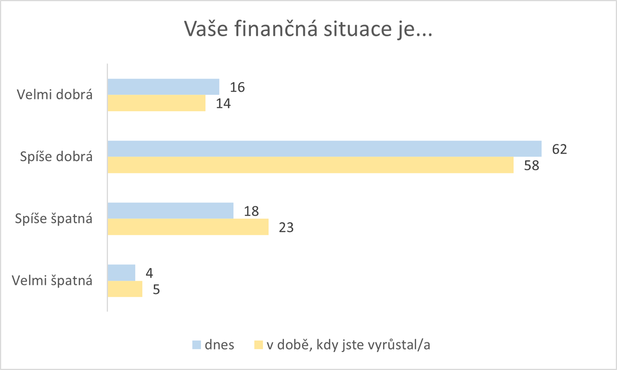 Mladí lidé hodnotí svoji finanční situaci jako dobrou. Spokojeno je s ní 78 % dotázaných, což je o 6 % více než v době, kdy vyrůstali. Životní standard tedy hodnotí jako lepší. Spokojenost roste s úrovní dosaženého vzdělání, rozdíl je znatelný mezi vysokoškoláky a lidmi s výučním listem (86 vs. 69 %). Zajímavým zjištěním je, že studenti středních (83 %) a vysokých (87 %) škol vnímají svou finanční situaci lépe než lidé v zaměstnání (79 %). Nejhůře jsou na tom však nezaměstnaní (54 %) a lidé na mateřské a rodičovské dovolené (63 %).